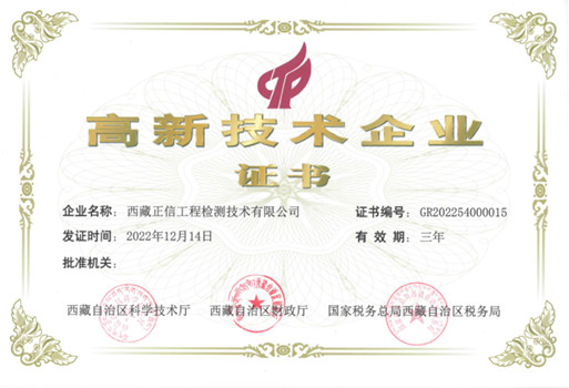 在2022年中,公司根據(jù)國(guó)家《高新技術(shù)企業(yè)認(rèn)定管理辦法》和《高新技術(shù)企業(yè)認(rèn)定管理工作指引》的相關(guān)規(guī)定,憑借專業(yè)的研發(fā)隊(duì)伍、雄厚的技術(shù)實(shí)力、持續(xù)的創(chuàng)新能力、科學(xué)的企業(yè)管理,西藏正信工程檢測(cè)技術(shù)有限公司被成功認(rèn)定為國(guó)家級(jí)高新技術(shù)企業(yè)。本次證書的獲得來之不易,這是西藏正信工程檢測(cè)技術(shù)有限公司扎根西藏9個(gè)年頭所取得的最有代表性的證書之一,同時(shí)也是公司發(fā)展史上的又一個(gè)里程碑。